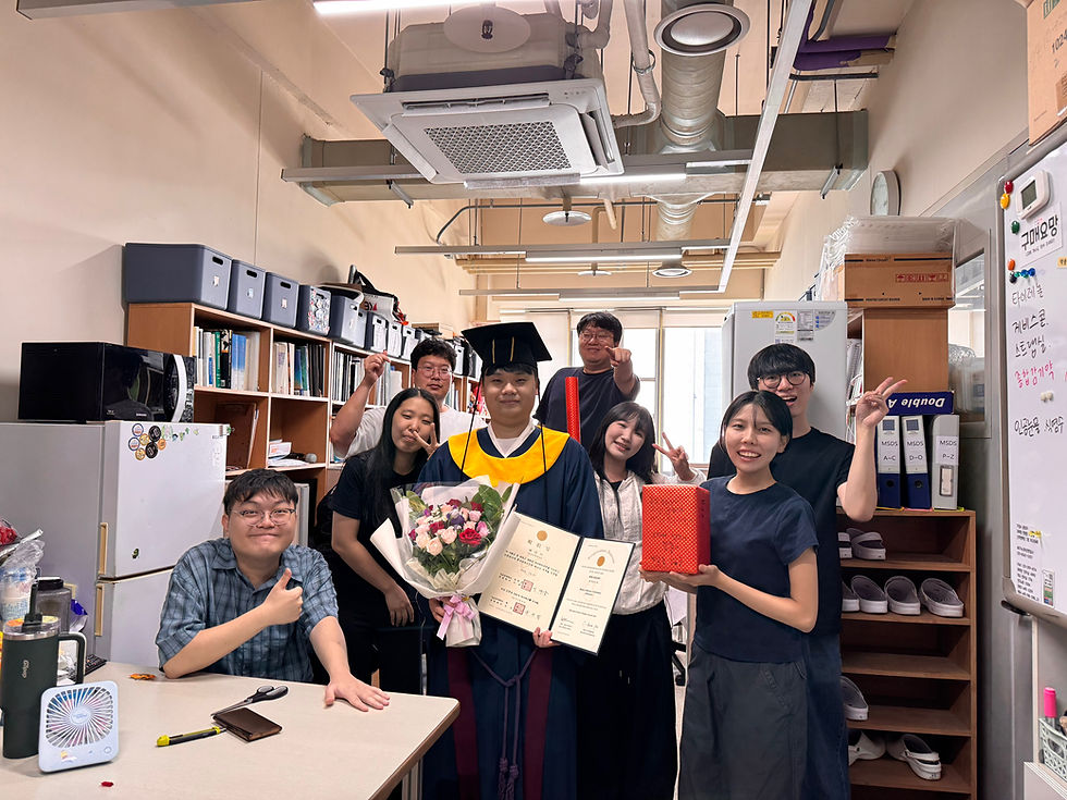 그 주인공은 바로바로바로바로바로 민기~~~~~~~~~~~~~~~~~~^^^^땡볕에 저 더운 옷 입고 있어서 땀 삐질뻘뻘 흘리고 있더라구요 불쌍해연구실에서 단체 사진 찍었어요 ^>^아쉽게도 교수님이 자리를 비우셔서 같이 사진을 못 찍게 된 민기...대리만족으로 교수님과 함께 하는 기분을 만들어 줬어요^.^ ^.^ ^.^~~~민기야 졸업 축하한다~!!